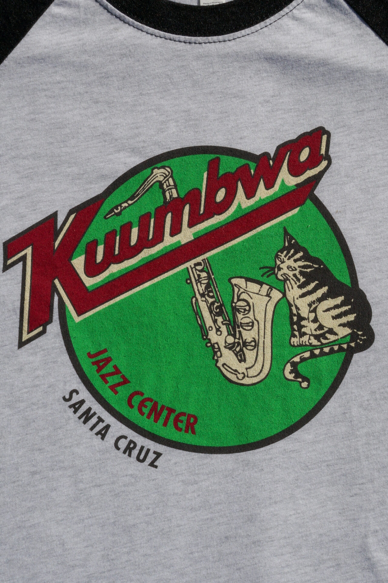 3/4 sleeve tri-blend raglan, featuring vintage Kuumbwa ‘Jazz Cat’ design, screen-printed by Catto’s Graphics – Santa Cruz, CA.
